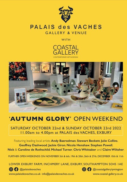 As the clocks change and the nights draw in, here’s something to lift your spirits – our next OPEN WEEKEND at Palais des Vaches, Exbury, featuring our joint exhibition with Coastal Gallery, Lymington, ‘AUTUMN GLORY’ . Open to view on Saturday November 5th and Sunday November 6th from 11am to 4pm at PALAIS DES VACHES, Lower Exbury Farm, Inchmery Lane, Exbury SO45 1AE.