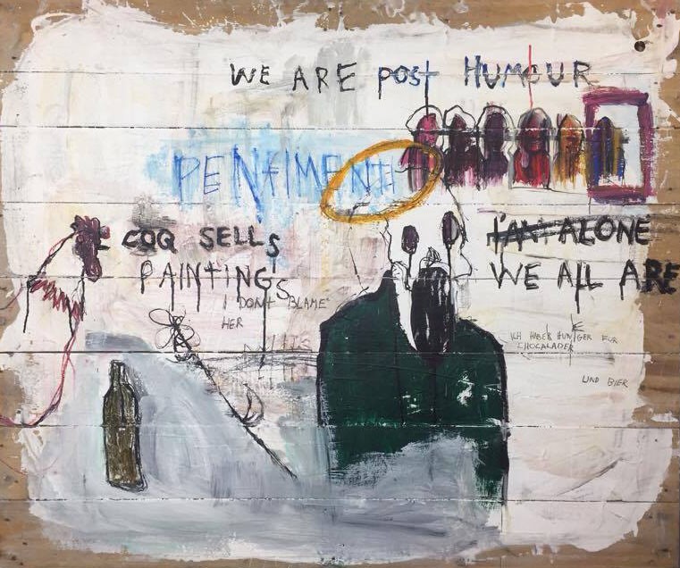 We are delighted to be exhibiting the work of Samual Kai who is currently studying fine art at AUB. Sam visited Coastal Gallery last year and we were immediately impressed by his enthusiastic commitment and approach to his work. Here is an extract from Sam’s own diary notes which informed his painting and which acknowledges the influences of both Basquiat and Rauschenberg. We look forward to showing more examples of Sam’s painting and progress – including exhibiting with us at ArtSway 2017. My intention within this project was to convey the feelings and sentiments that comes with losing a close friend and confidante; that is to say that I wish wished to convey ‘grief’. I wished to allow this project to flow seamlessly from the last and so these two projects should be viewed together. I kept a diary from around the time of Daniel’s death. This diary recorded my thoughts, mostly in ambiguous drawings and short cryptic phrases to protect those involved. In places, I was more candid so I sealed these pages with tape or painted over in acrylic. These diary pages were used to inform a large painting on builder’s pallets. I wished to produce more paintings but I failed to do so. My only excuse was my low mood at the time. In an attempt to counter this effect, I initiated a new sketchbook entitled ‘Book of cartoons and shitty doodles when I’m too depressed to draw’ so that I could produce work without pressure of complying to an aesthetic style. This solution was only partially successful. I studied Francisco Goya’s series of prints entitled ‘Disasters of war’ and the additions made by the Chapman brothers to these iconic works. I hope that in doing so, I could convey some fraction of the horror that the Spanish master and contemporary British duo command. I failed to do so. I also gained inspiration from the prints and drawings by both Louise Bourgeois and Tracey Emin, in an attempt to imbue my drawings with a similar emotional potency. I (mostly) failed to do so. My painting was stylistically influenced by the neo-expressionists such as Jean Michel-Basquiat but also Robert Rauschenberg (who, despite not being considered a neo-expressionist, probably influenced Basquiat).